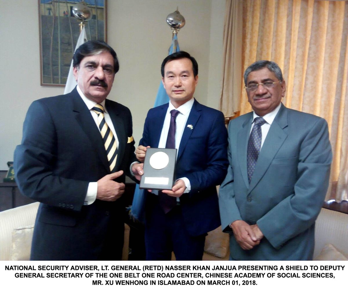 Deputy General Secretary One Belt One Road Xu Wenhong called on National Security Adviser Nasser Khan Janjua in Islamabad. They discussed the regional security situation and various aspects of One Belt One Road vision of China.pic.twitter.com/oB9QGmJH9b