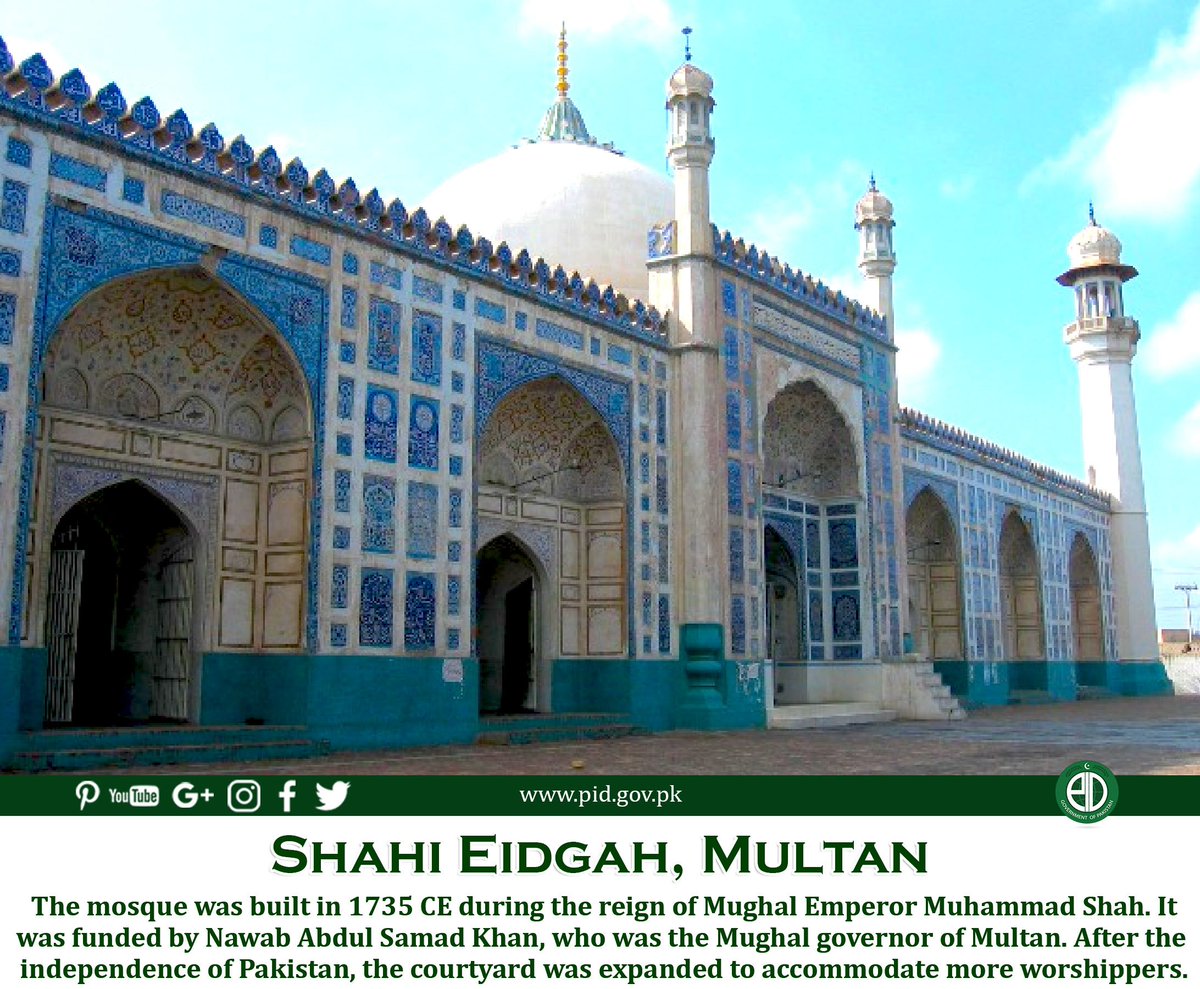 The mosque is spacious, with a vast courtyard & a prayer chamber measuring, and features seven domes. The mosque's exterior is embellished with glazed blue #Multan-style tiles, while the interior is ornamented with intricate mosaics. #BeautifulPakistan 🇵🇰 @Pakistaninpicspic.twitter.com/fcrbkfJQCe