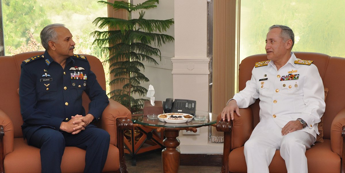 Air Chief Marshal, Mujahid Anwar Khan made his first visit to Naval Headquarters Islamabad on Thursday and met Naval Chief Admiral Zafar Mahmood Abbasi. During the meeting, Admiral Zafar Mahmood Abbasi congratulated the Air Chief on assuming Command of Pakistan Air Force.pic.twitter.com/FXo1v80TdV