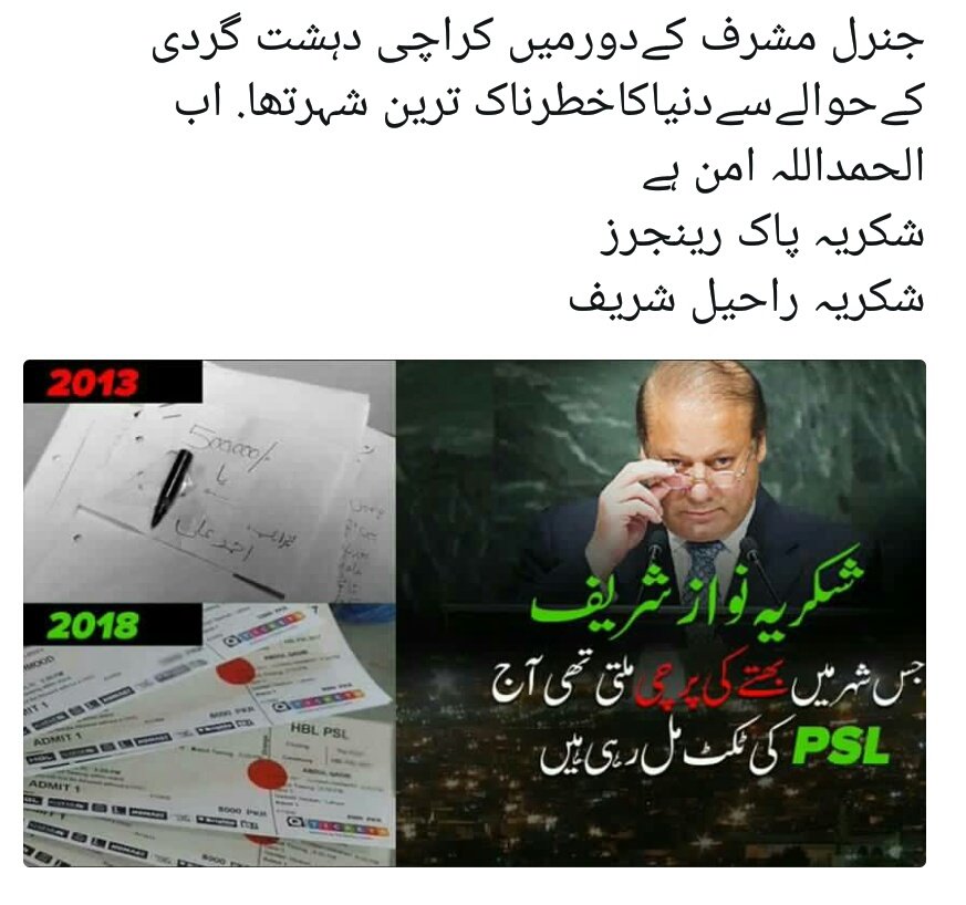 اپ اپنے منہ سے جتنی مرضی اپنی تعریف کریں اور کرکٹ کا کریڈٹ زبردستی اپنے کھاتے میں ڈالنا چاہے مگر ہر ذی شعور انسان جانتاھے کہ 2013 سی پہلے یہ ارمی یہ رینجر سیکورٹی فورسز موجود تھےامن تھا نہ سکون نہ کرکٹ تھی بس ڈرون حملے تھے دہشتگردی بھتہ خوری، ٹارگٹ کلنگ ضرور تھی اندھیرے تھے