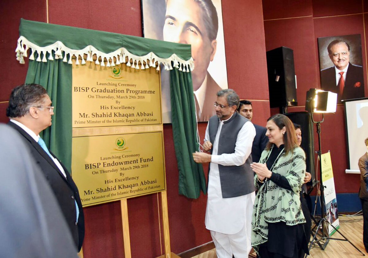 Prime Minister Shahid Khaqan Abbasi unveiling the plaque to launch BISP Graduation Programme and BISP Endowment Fund at Benazir Income Support Program (BISP) Headquarters Islamabad.pic.twitter.com/hs1KRTlzhu
