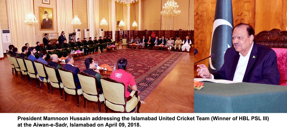 President Mamnoon Hussain says terrorism has been defeated and peace has won by the successful conduct of Pakistan Super League (#PSL). He was talking to winner team of PSL, Islamabad United and its management in Islamabad.pic.twitter.com/Owjx1eQ0a3
