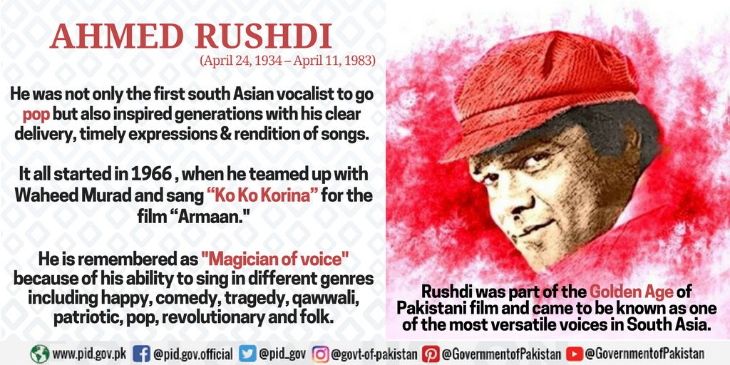 35th Death Anniversary of Ahmed Rushdi is being observed today. #Rushdi is considered to be the first pop singer of South Asia as he introduced hip-hop, rock n roll, disco and other modern genres in South Asian music.