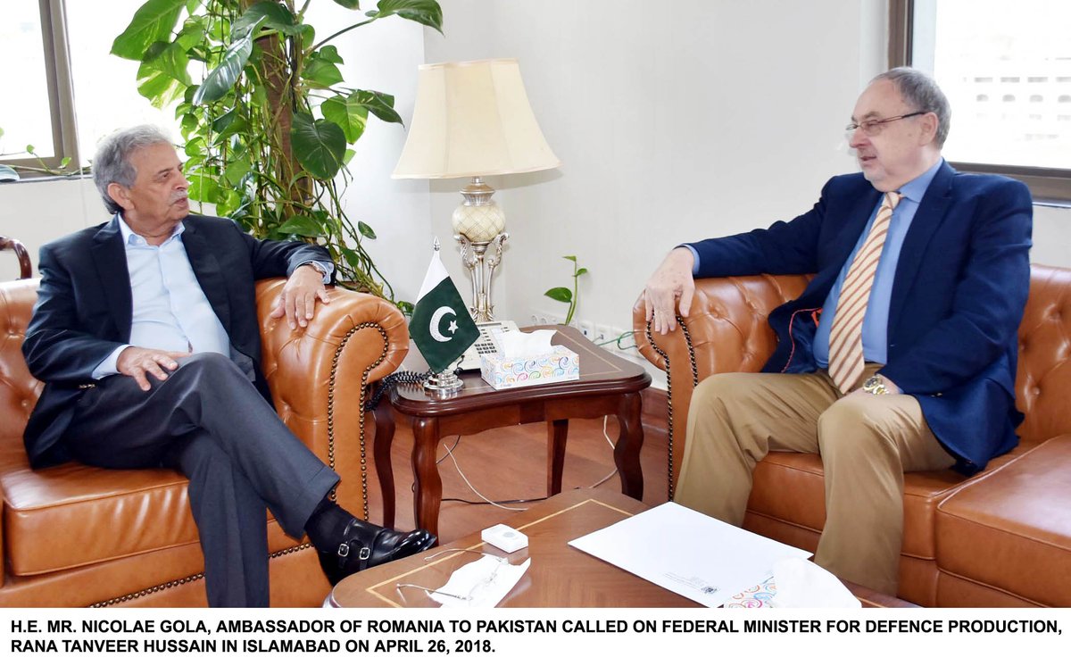 Pakistan offers #Romania to explore the potential of joint collaboration and mutual cooperation in defence production. The offer was made by Minister of Defence Production Rana Tanveer Hussain during a meeting with Ambassador of Romania Nicolae Gola in Islamabad.pic.twitter.com/n5zlcvXe8P