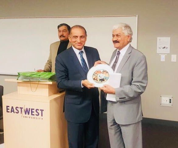 Ambassador Aizaz Ahmad Chaudhry presenting shield to Dr. Wasiullah Khan, Chancellor of East-West University at the conclusion of a successful Iqbal Society seminar in Chicago.pic.twitter.com/TSHS7kQIaI
