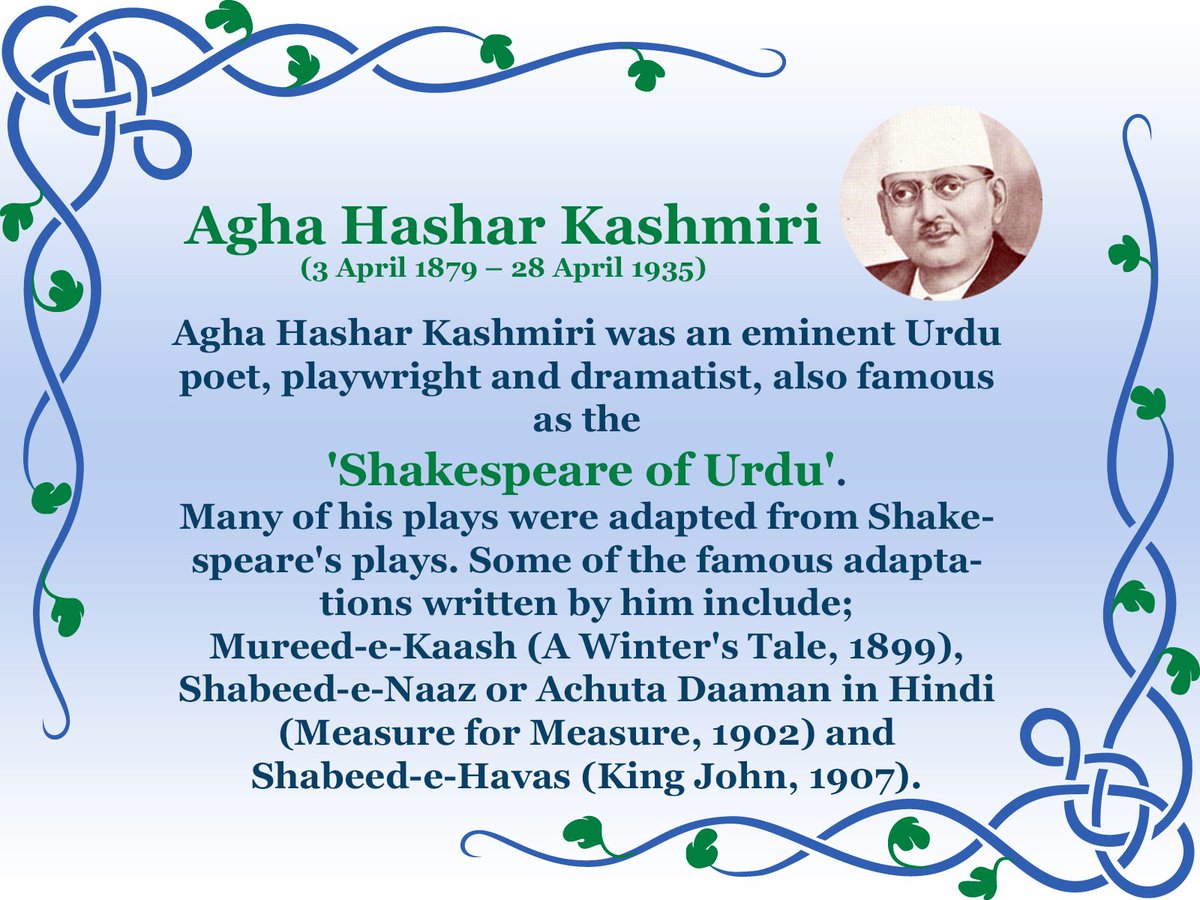 Agha Hashar Kashmiri was an eminent Urdu poet, playwright and dramatist who was called the "Shakespeare of Urdu". His famous works in #Urdu include Khwaab Hasti, Khoobsoorat Bala, Aseer-e-Hirs, Mureed-e-Shak, Shaheed-e-Naz and Sufaid Khoon.