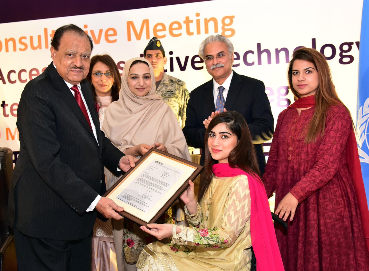 President Mamnoon Hussain presenting Official Nomination Letter of WHO Goodwill Ambassador of Disabilities to Dr Sana Hafeez during the inaugural session of WHO Inter Country Meeting on Assistive Technology in Islamabad.pic.twitter.com/WTw5rxnE6Q