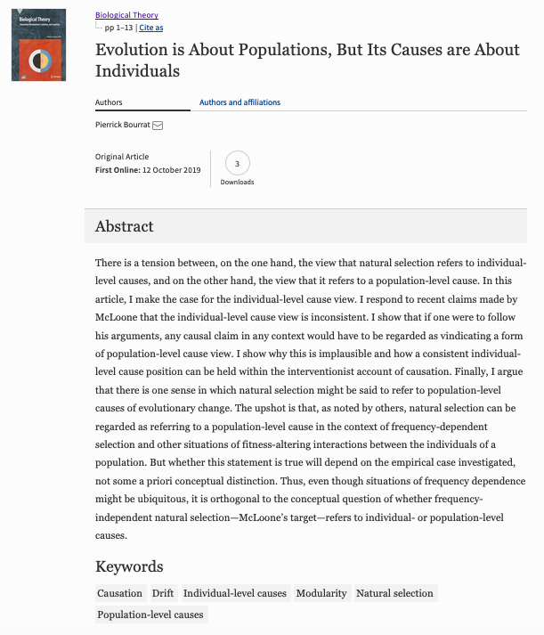 New article out! "Evolution is About Populations, But Its Causes are About Individuals" by Pierrick Bourrat, just published in Biological Theory! Read it here: https://rdcu.be/bUlur