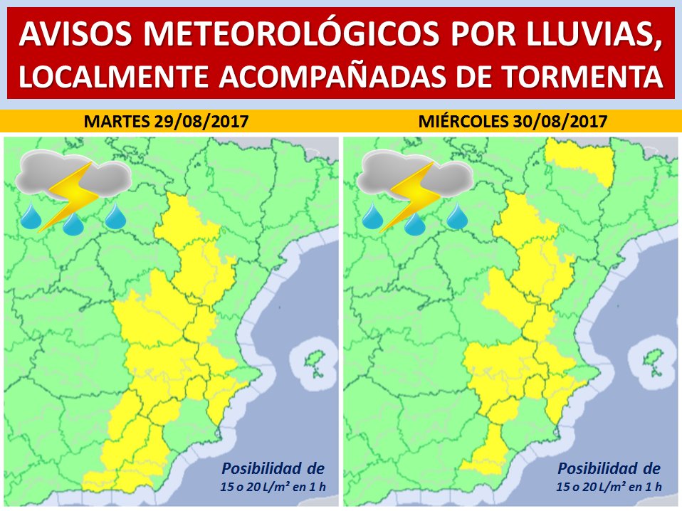 #lluvias y#tormentas,#martes y#miércoles, en buena parte de la franja oriental de la Península Ibérica