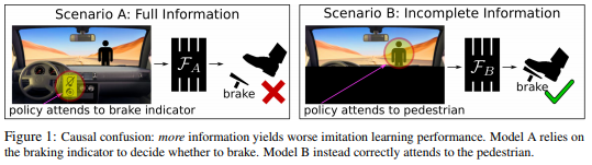 Behavioral cloning can't distinguish the cause of an action from its effect, resulting in counter-intuitive issues, e.g. policies that perform worse when given more information. How can we resolve this "causal confusion"? https://arxiv.org/abs/1905.11979 w/ Pim de Haan &