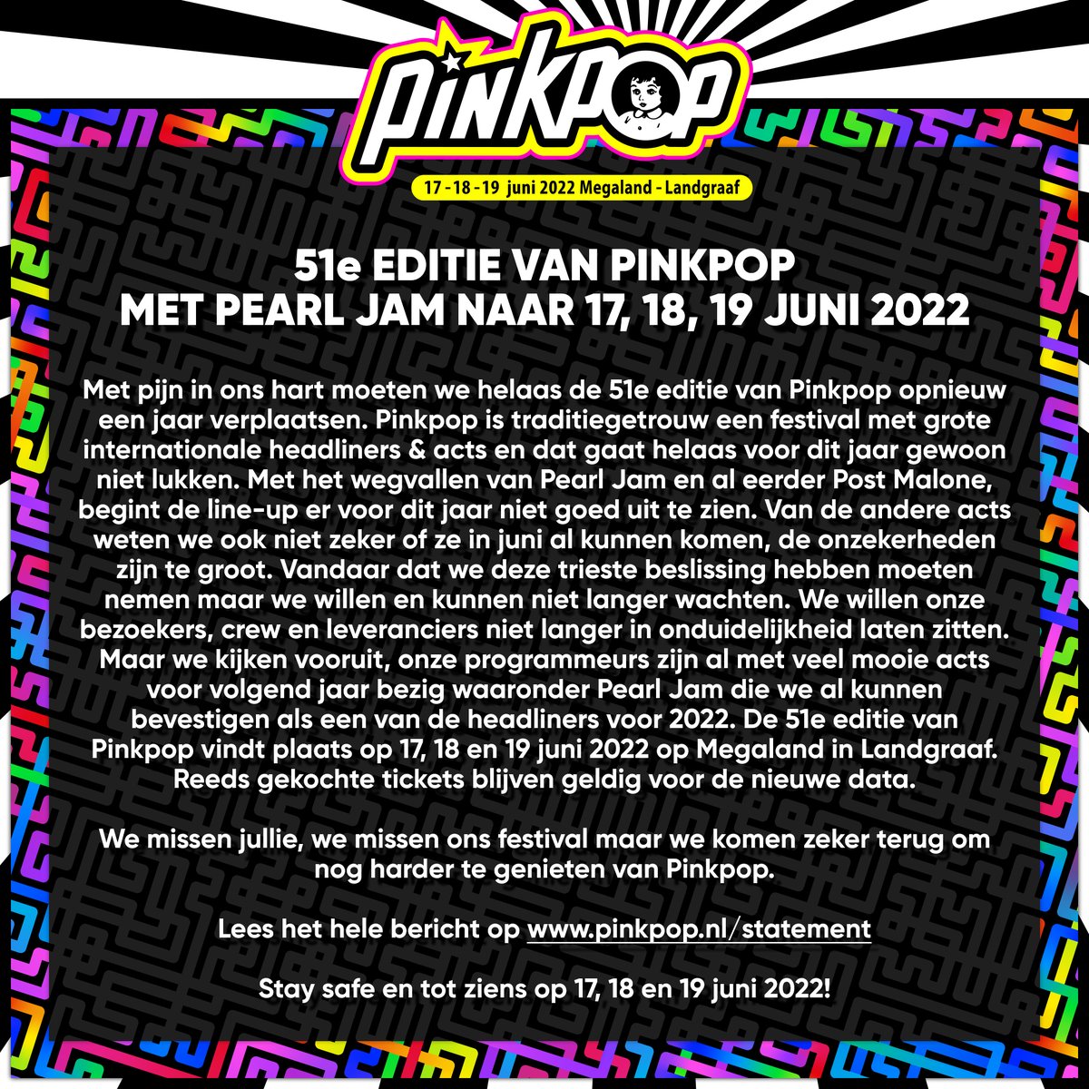 8. De 51e editie van Pinkpop wordt verplaatst naar 17, 18, 19 juni 2022. Reeds gekochte tickets blijven geldig voor de nieuwe data. Leuk nieuws: is zojuist bevestigd als eerste headliner. Lees ons gehele statement op .