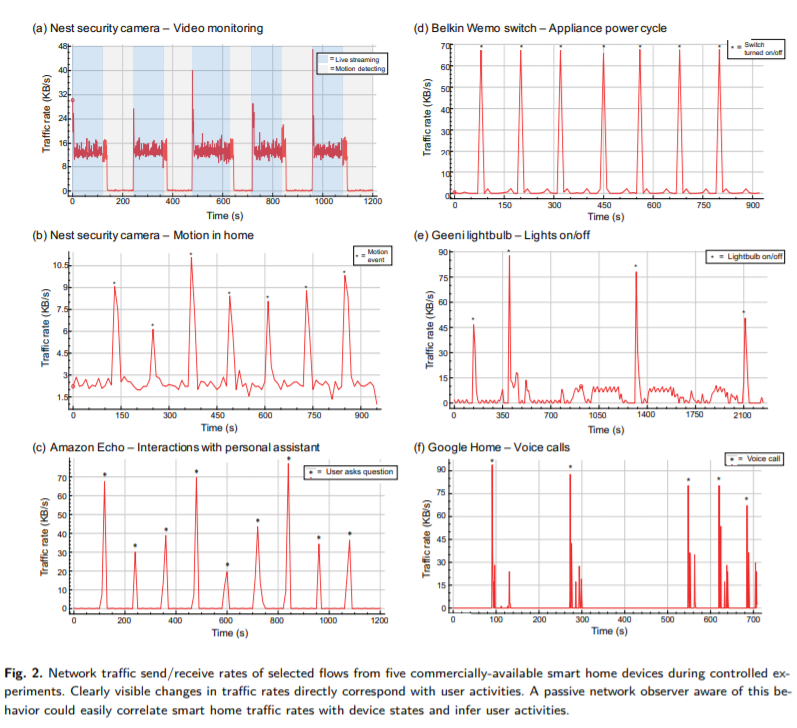 Fortunately, most IoT traffic today is encrypted. Unfortunately, even encrypted traffic reveals a lot about your activities in the home. We reveal these weaknesses and propose mitigations: https://arxiv.org/pdf/1812.00955.pdf … Noah Apthorpe will present the paper tomorrow at