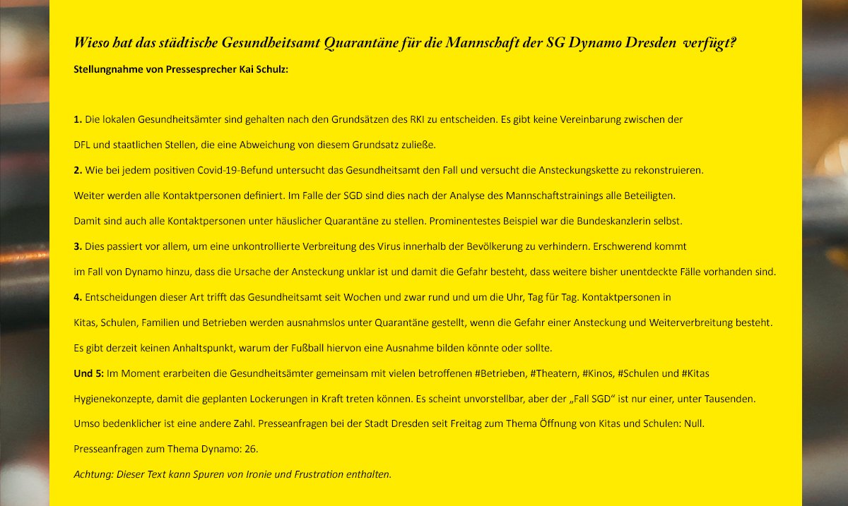 #Dynamo: 26. Sprecher Kai Schulz: "Anstatt 20 Millionen Bundestrainern haben wir jetzt anscheinend 20 Millionen Virologen…."#sgd1953#DFL#Bundesliga#COVID19pic.twitter.com/efMwXMmhEj