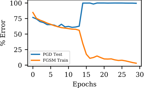 1/ New paper on an old topic: turns out, FGSM works as well as PGD for adversarial training!* *Just avoid catastrophic overfitting, as seen in picture Paper: https://arxiv.org/abs/2001.03994 Code: https://github.com/locuslab/fast_adversarial … Joint work with