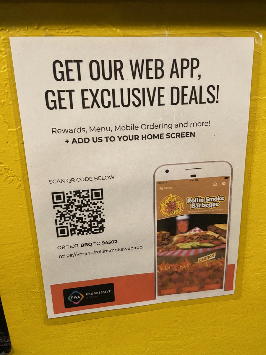 "Add us to your home screen" I'm always wondering how many users actually understand what that means. But it's good to see PWAs used where they belong! BTW, the actual URL of the restaurant has a service worker but no manifest. Check it at https://apps.vdomobile.com/m/rollinsmokebbqlv/ …https://twitter.com/Daniel_Rubino/status/1217205658900140033 …