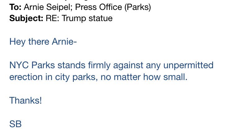 @NYCParks statement on@realDonaldTrump nude statue was real, but my editor got confirmation:pic.twitter.com/li9If1WQOp