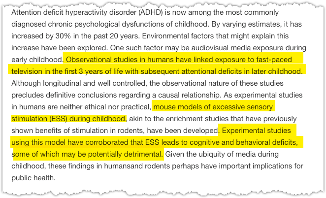 tl;dr: Mice that watch too much TV become almost as broken as do humans that watched too much TV as kids How early media exposure may affect cognitive function: A review of results from observations in humans and experiments in mice https://buff.ly/2OAAti4 pic.twitter.com/odV6wcqqn9
