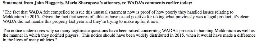 Sharapova's lawyer answers to request of comment about the WADA statement :pic.twitter.com/HVe94zUCL3