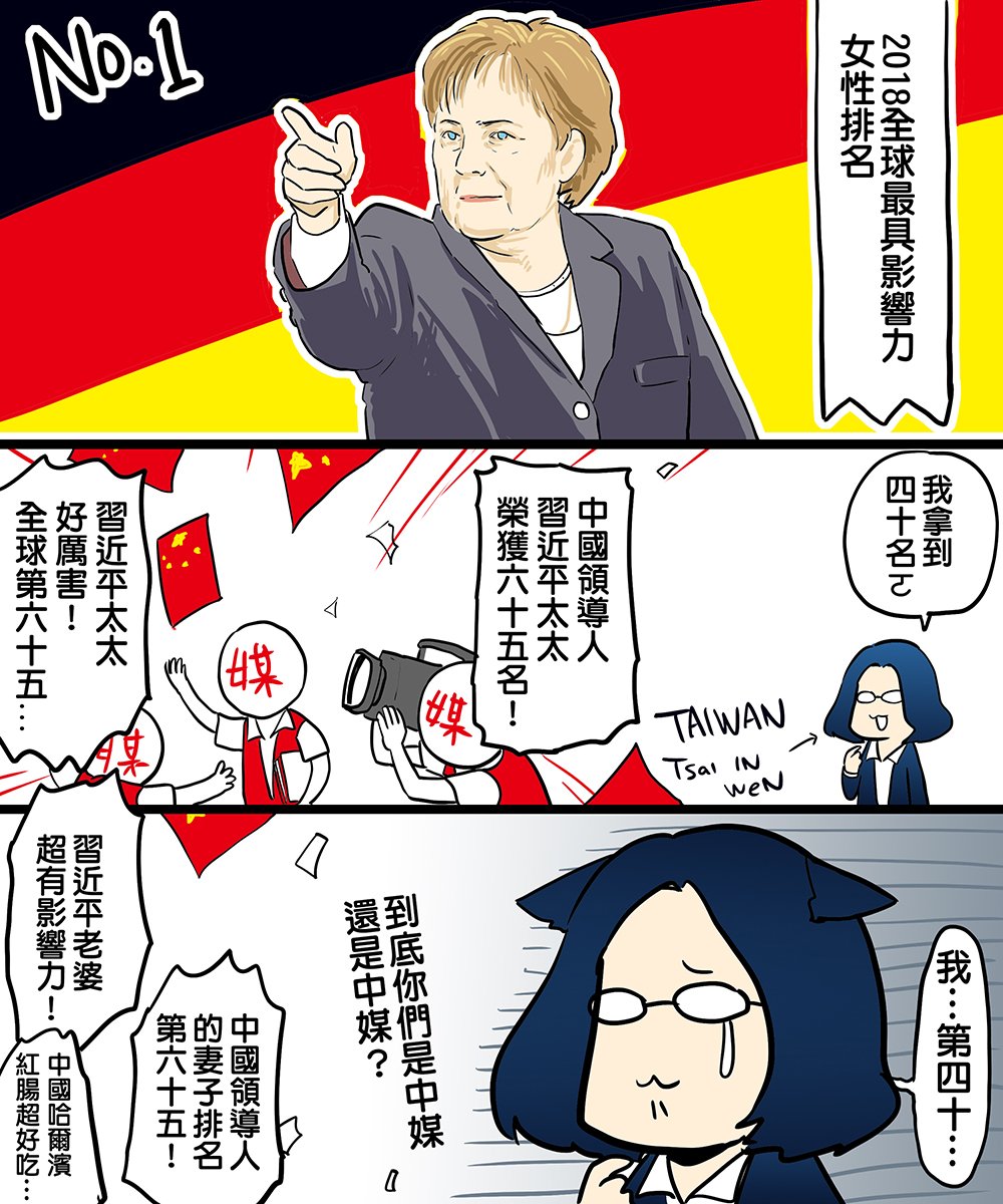 「你應該為自己人感到驕傲」 富比士公布2018年全球百大影響力女性,第一名當然是德國總理梅克爾,而我們的總統是第幾名呢?有媒體告訴你了嗎? 中華民國總統是一隻貓,是一隻不會張揚自己成就的無口貓,想想操縱的蔡英文總統排名是世界第四十名。 她是咱的總統,你應該要知道:她很厲害。pic.twitter.com/uPjs4u3VlW