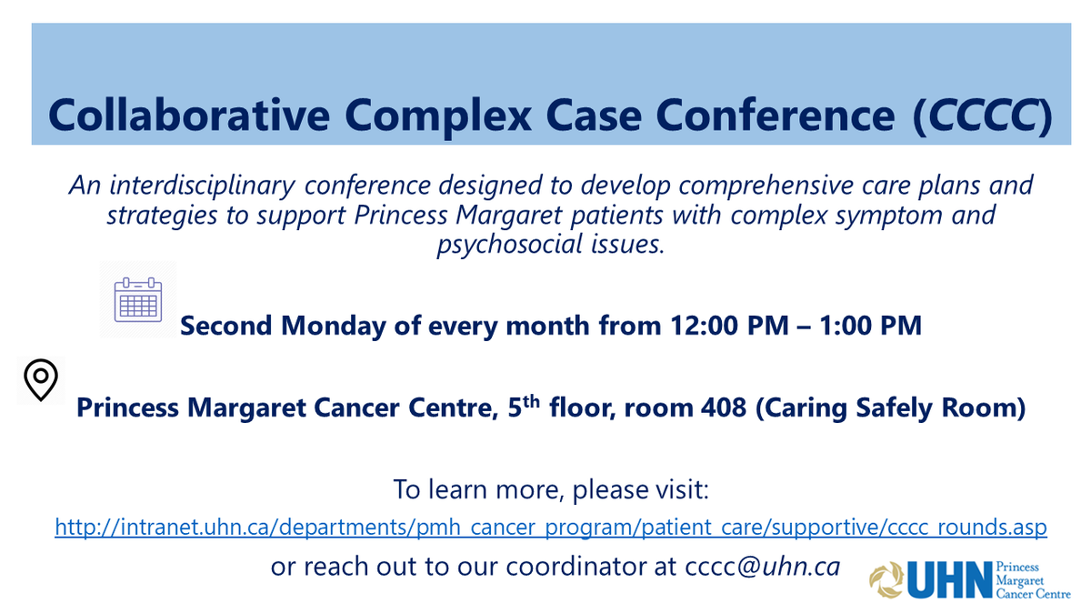 #Collaborative Complex Case Conference is successfully underway! To learn more about this great initiative or request for a patient case to be discussed, please visit http://intranet.uhn.ca/departments/pmh_cancer_program/patient_care/supportive/cccc_rounds.asp … or email cccc@uhn.ca.pic.twitter.com/wskuaHgYd2