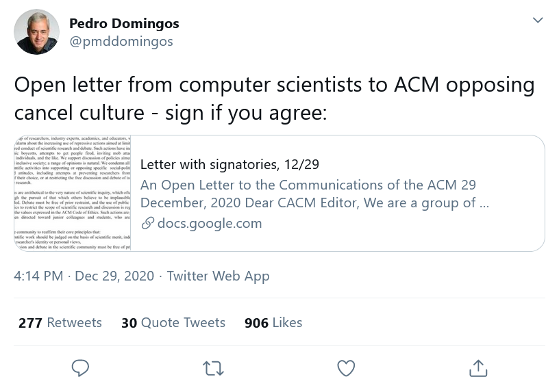 As usual, some of the responses to this anti-cancel-culture letter prove its point:https://twitter.com/BoredAlanTuring/status/1344362170612592640?s=20 …