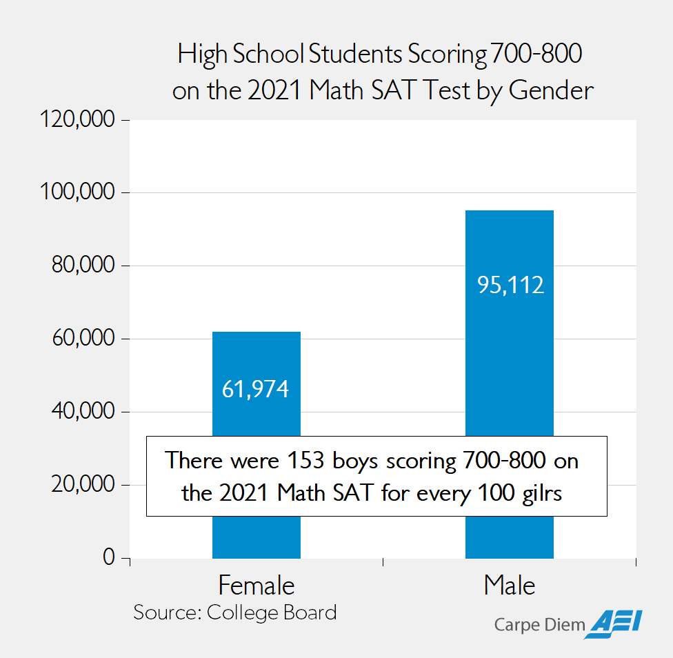 Following a long-term historical reality, high school boys have greater math aptitude and out-perform high school girls on the Math SAT, especially for the highest test scores. In 2021, 153 boys scored 700-800 for every 100 girls. Not. Even. Close. @Chsommers @amyalkonpic.twitter.com/IZECqGoshA