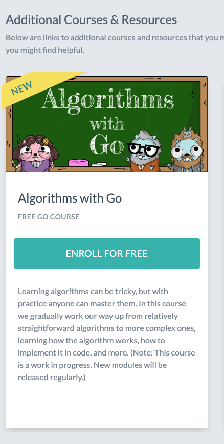 If you already have an account at http://courses.calhoun.io you should see this now. Clicking the button will add it to your account. If you don't have an account yet, go to http://gophercises.com and sign up. I'll get the landing page + signup form for Algo w/ Go working tomorrowpic.twitter.com/50v9nNF9vh
