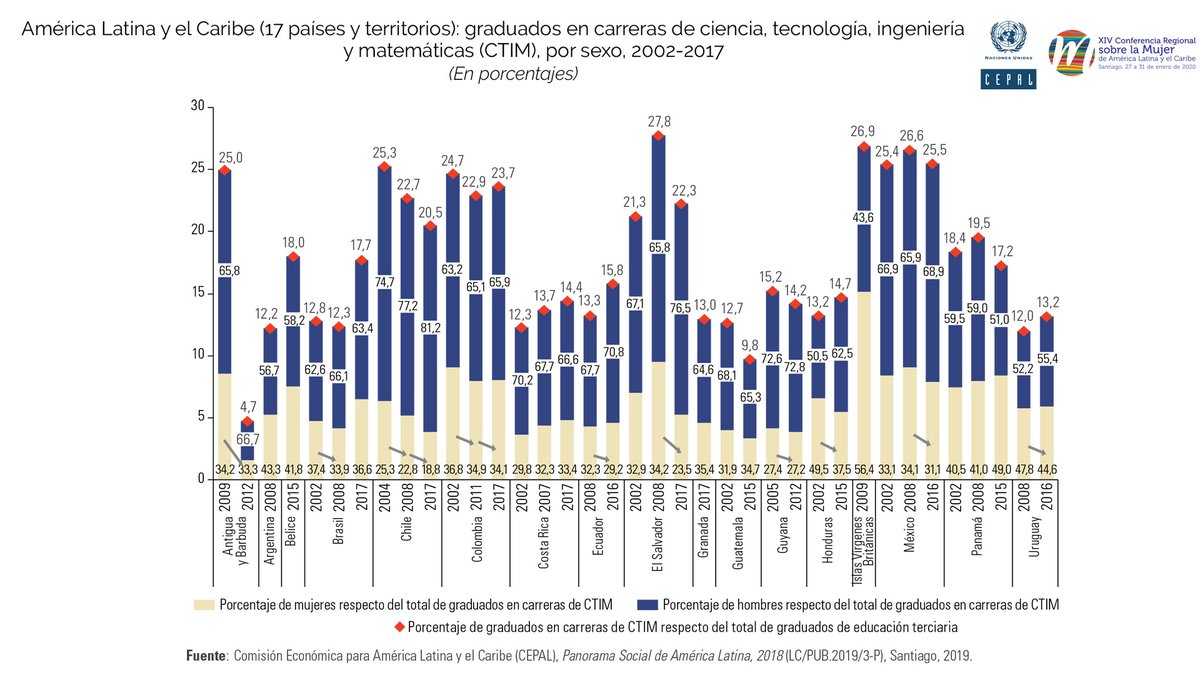 #mujeresALC están subrepresentadas en los campos de ciencia, tecnología, ingeniería y matemáticas, lo que limita sus posibilidades de una mejor inserción económica, alerta informe#CEPAL que se discute en#XIVConferenciaMujer. Averigua más: http://bit.ly/2S55MS7 pic.twitter.com/Jnc5oWdmZI