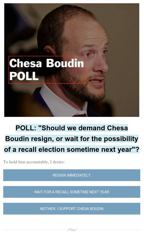 Our committee is running a 72hr poll of 2,365 voters, asks if they are willing to wait til sometime next year for a @chesaboudin recall election, or he resign immediately. So far, 6 hours into the poll: 88.5% want him resign now, 10.5% wait til a recall election, 1% support him.pic.twitter.com/OCbaW9DzEK