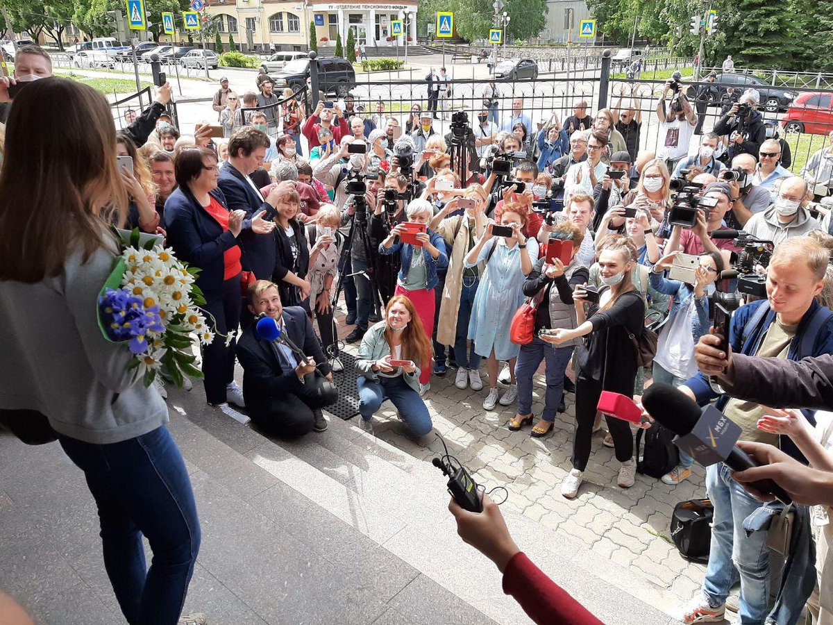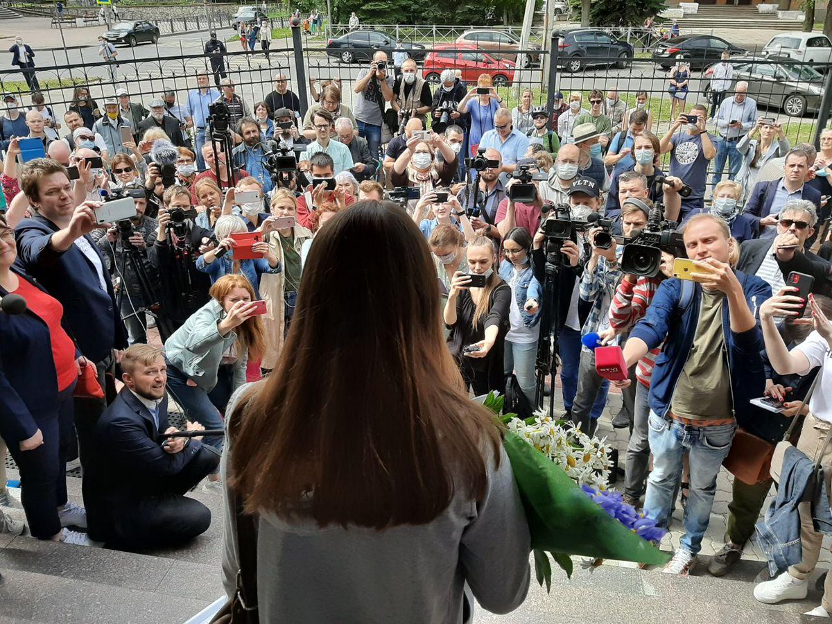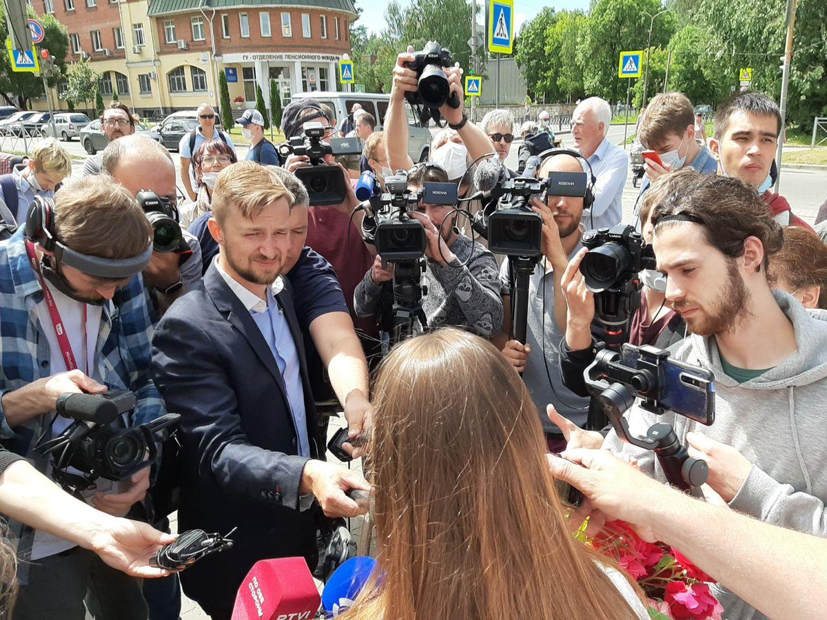 Monday. (July 6) A military court in Pskov convicts journalist Svetlana Prokopyeva, accused of justifying terrorism in a 2019 article - she avoids a 6-year sentence, gets a ~$7000 fine. Russian journalists travel to Pskov to protest outside the trial.pic.twitter.com/kiWcAVV5Fa