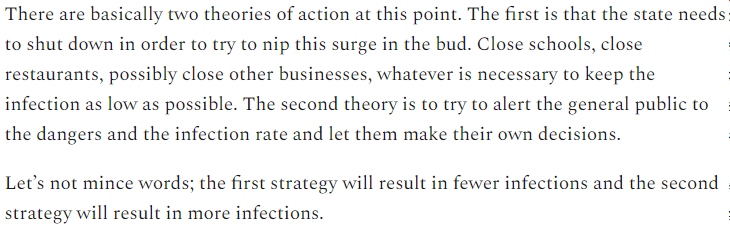 I feel like this is where strong government action makes sense, if you just tell people that we're in the middle of a surge and to be careful, people will naturally do less risky activities (going to bars, movies, restaurants, etc), but these businesses will struggle (1)