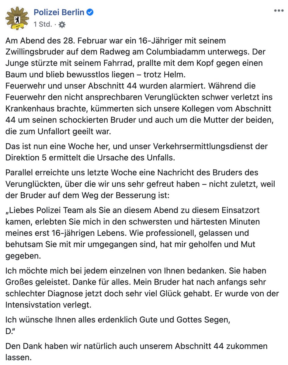 „Liebes Polizei Team, als Sie an diesem Abend zu diesem Einsatzort kamen, erlebten Sie mich in den schwersten und härtesten Minuten meines erst 16-jährigen Lebens. Wie professionell, gelassen und behutsam Sie mit mir umgegangen sind, hat mir geholfen und Mut gegeben."pic.twitter.com/YFu2G1j2ht