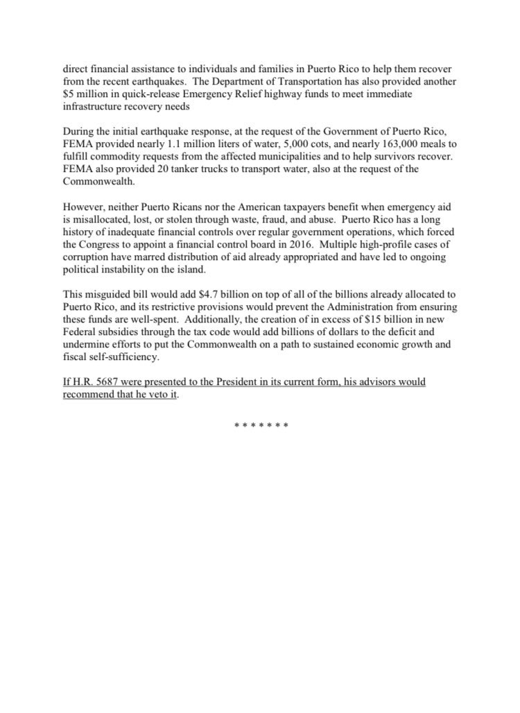La Gobernadora y la Comisionada Residente fueron ayer a aplaudir a Trump. Hoy el Presidente les da las gracias “negándose fuertemente” a apoyar asignaciones para el terremoto y les recuerda el mal manejo de su gobierno a las ayudas de emergencia. Aquí la declaración oficial