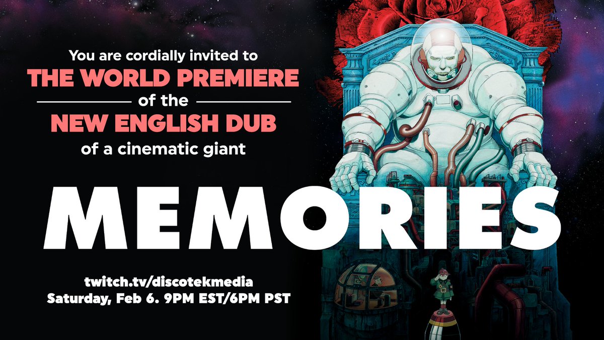 Last call if you don't want to miss the premiere of the English dub of Memories! Get to our Twitch RIGHT NOW! https://www.twitch.tv/discotekmedia pic.twitter.com/CTzAFCUvja