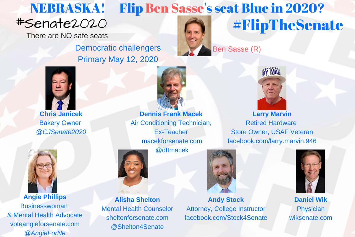 Hey #NEBRASKA #SENATOR Dem Challengers Chris Janicek @CJSenate2020 Dennis Macek @dftmacek Larry Marvin http://facebook.com/larry.marvin.946 … Angie Phillips @AngieForNe Alisha Shelton @Shelton4Senate Andy Stock http://facebook.com/Stock4Senate  Daniel Wik http://wiksenate.com  #FlipTheSenate THREADpic.twitter.com/0wKwJ17fSB