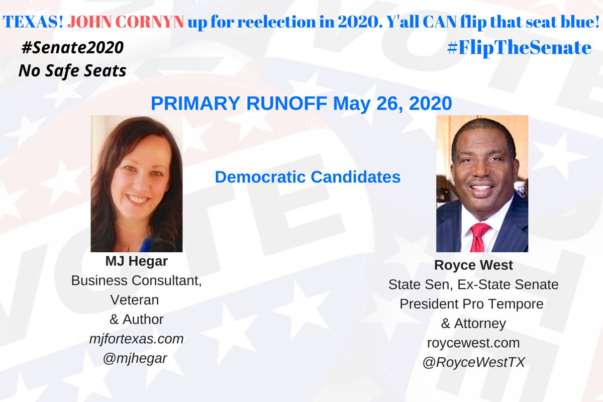 TEXAS! Cornyn must go! #Senate2020 #NoSafeSeats Primary RUNOFF Election MAY 26, 2020 2 Democratic Challengers #TX: MJ Hegar @mjhegar https://mjfortexas.com/  & Royce West @RoyceWestTX @RoyceWestTX http://roycewest.com  #DemCastTX #FlipTheSenate THREAD #23GOPpic.twitter.com/O6cvQQE533