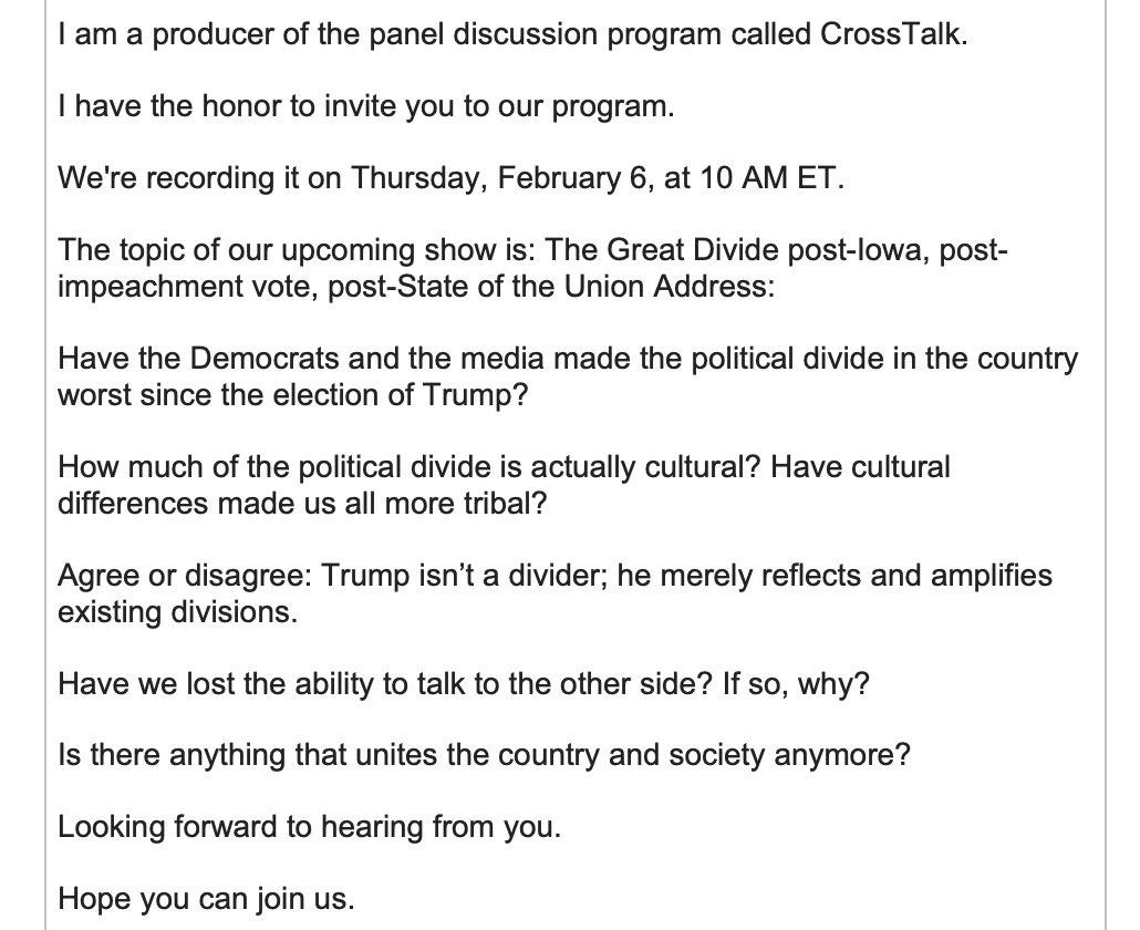 Inbox: A booker for Russia Today asks me to come talk about "The Great Divide" in the US. "Is there anything that unites the country and society anymore?" Pass.pic.twitter.com/Js3NFYDthO