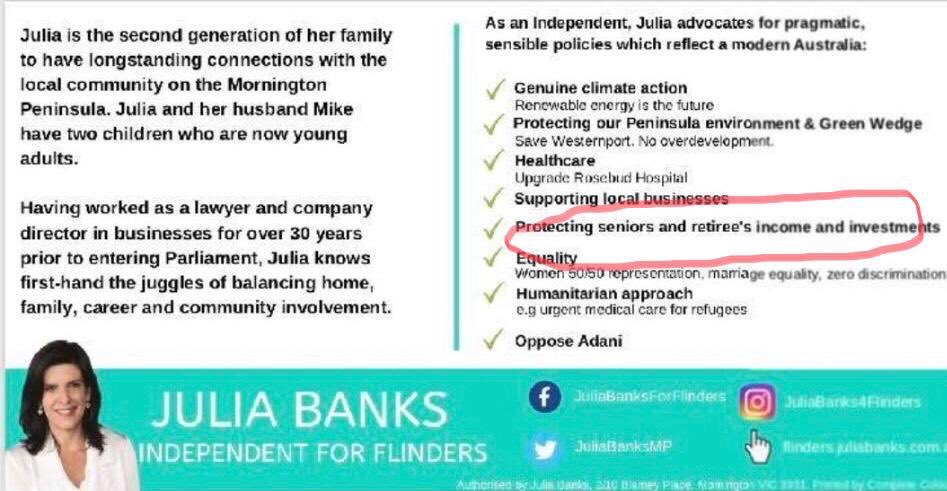 Julia Banks says she wants to protect retirees income...yet she is preferencing LABOR?? Labor’s retiree tax will hit around 900,000 retirees with 84% on taxable incomes below $37,000. It’s official: a vote for Julia Banks in