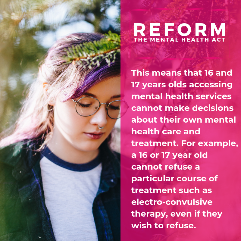 The Mental Health Act needs to be updated so that 16 and 17 year olds have a legal right to consent or refuse mental health treatment, just as they have the right to consent or refuse physical health treatment.