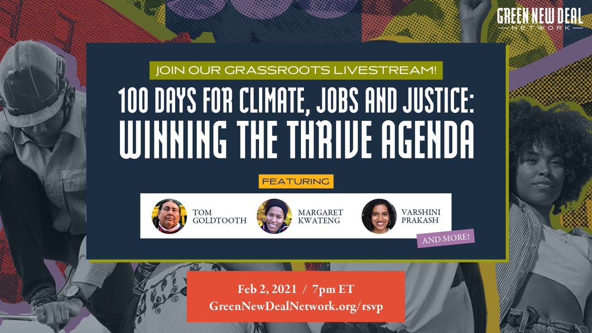 #THRIVEAgenda will transform our economy, putting people to work in#climate and care#jobs and advancing racial and social justice. Learn more about what it is and how we win it on our livestream Tuesday, Feb 2nd @ 7PM ET. RSVP at: http://GreenNewDealNetwork.org/rsvp pic.twitter.com/mLShiU97Wy