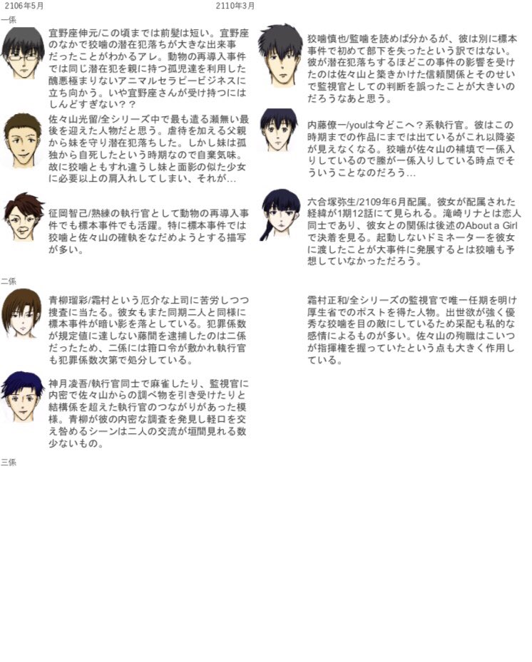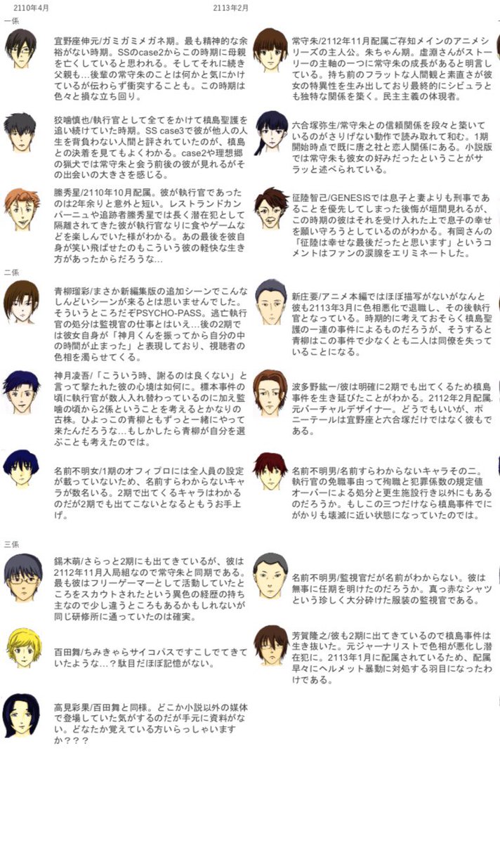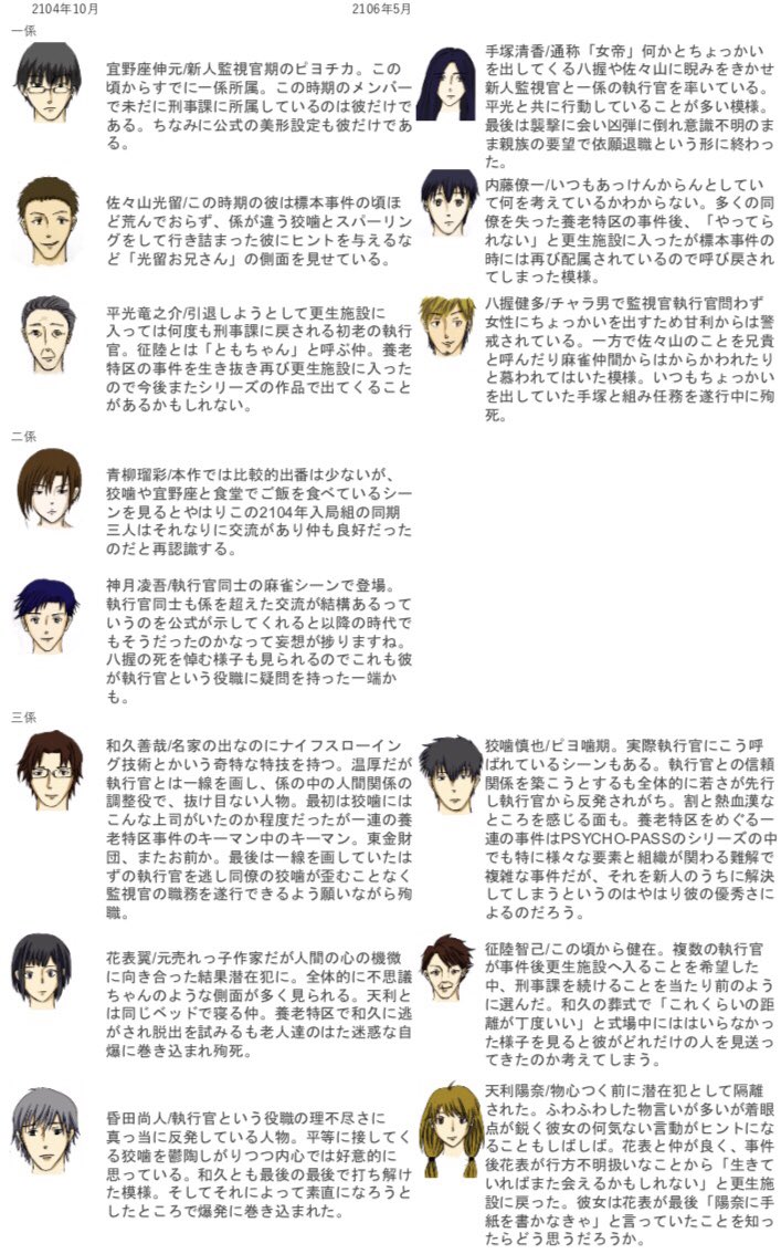 ※PSYCHO-PASS関連作品全方位ネタバレ注意 PSYCHO-PASSは関連作品も同じ時間軸にあるようなので、まとめた刑事課の人員表作ってみた 公式の年表がアニメの方の出来事しか反映してないので… 普段絵を描かない方のオタクなのに頑張った!pic.twitter.com/5XqrWFtb6i