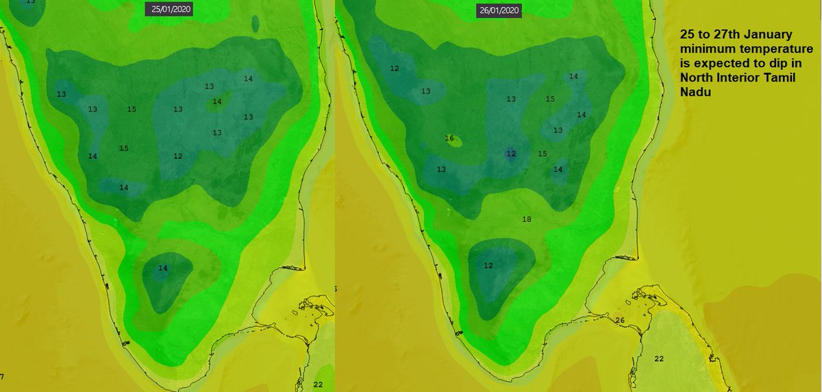 Minimum Temperature is expected to fall in North Interior Tamil Nadu for 3 days between 25-27th Jan. Chennai had one day winter (temp below 20C) this year when temp dropped to 18.7 C on 14th Jan. Good chances of Chennai Temp dropping below 20 C on 25-26th https://www.facebook.com/tamilnaduweatherman/posts/2754631354764131 …pic.twitter.com/kiufZl9TEC