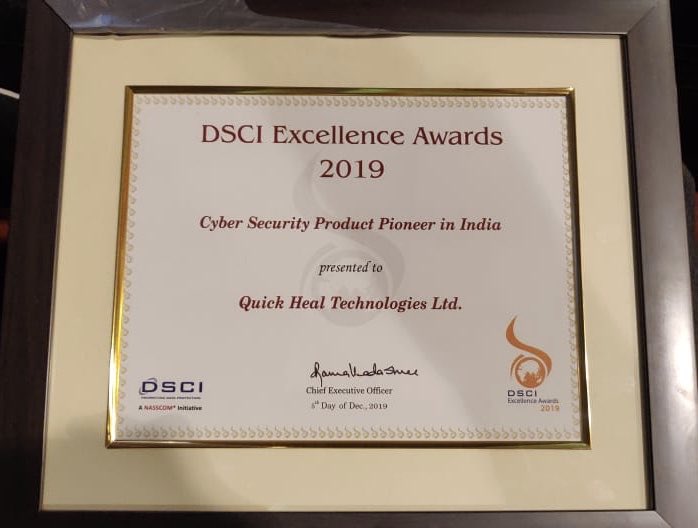 Quick Heal receives the DSCI Excellence Award 2019 for Cyber Security Product Pioneer in India. Congratulations to the whole team at