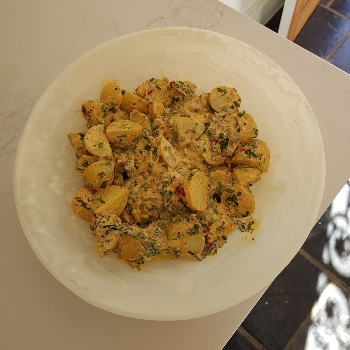 just made a fuckin good potato salad. straight off the bat if you try to roast me i will report you as abusive. spring onions, lime juice, garlic chives, smoked chilli, mustard, kewpie mayo, shredded apple and cornichons. fuck you if you don't like itpic.twitter.com/vYsH8zXLUB