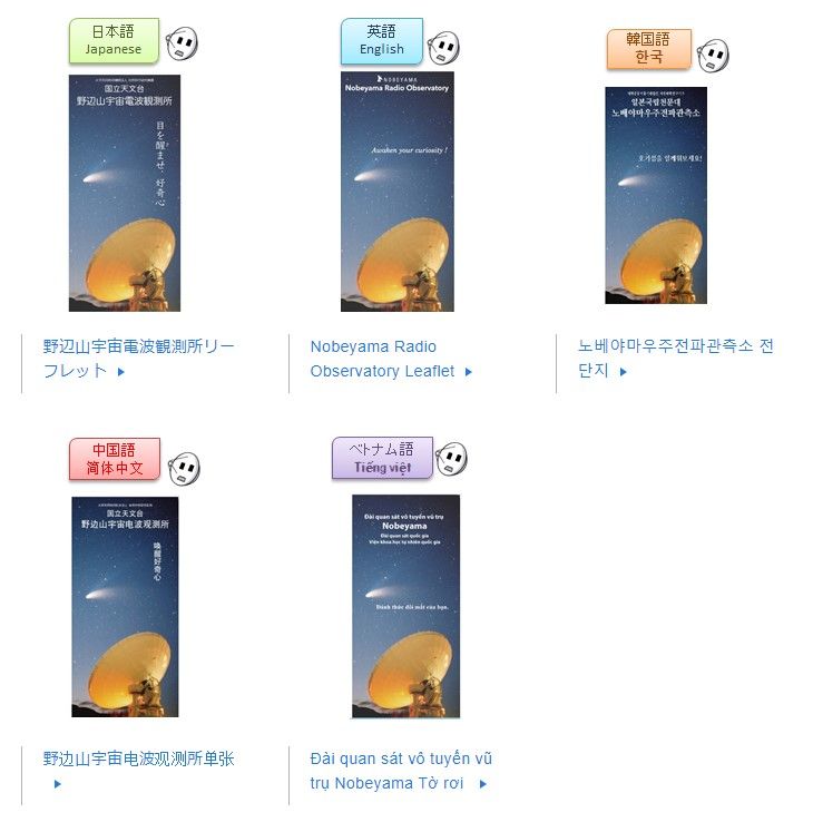 Multilingual leaflets of NAOJ Nobeyama Radio Observatory have been released! The available languages are Japanese, English, Korean, Chinese, and Vietnamese. Download the free PDF leaflets here: https://www.nro.nao.ac.jp/en/public/mlleaflet/mllflt.html …pic.twitter.com/Ri9sXboqxI