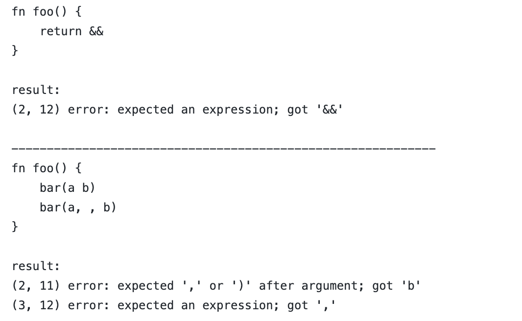 Improved error handling wherever expressions are expected. Previously, some parse errors would trigger a hard assert, because I wanted to focus on parsing "correct" code first. Those asserts are gone now; the parser will log an error and recover gracefully in all cases.pic.twitter.com/1XjP5kCbZR
