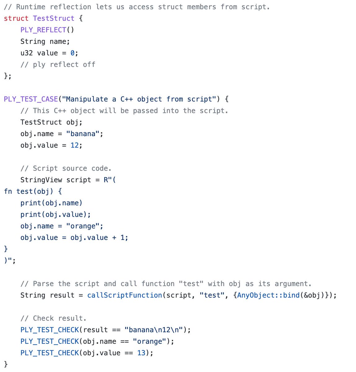 Here's a lil scripting language I've been working on. No parser generator: Just a hand-written parser. No bytecode: The parse tree is "executed" directly. It integrates with C++ using reflection. Still WIP! I'll post the next few updates here