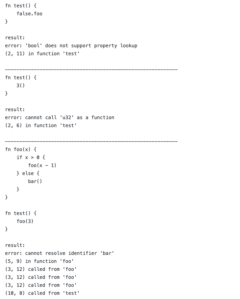 Finally implemented runtime error handling. Default behavior is to log an error message with a stack trace, then halt the script — like many other scripting languages.pic.twitter.com/iLoosw9SmJ