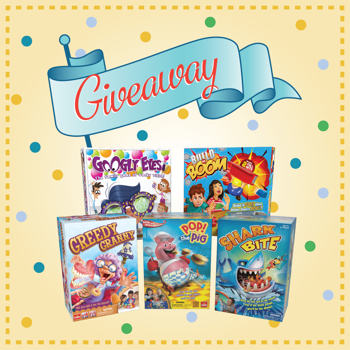 We're giving away 10 prize packs featuring Greedy Granny, Pop the Pig, Googly Eyes, Shark Bite, and Build or Boom. Click the link to enter