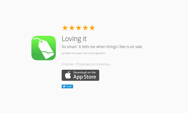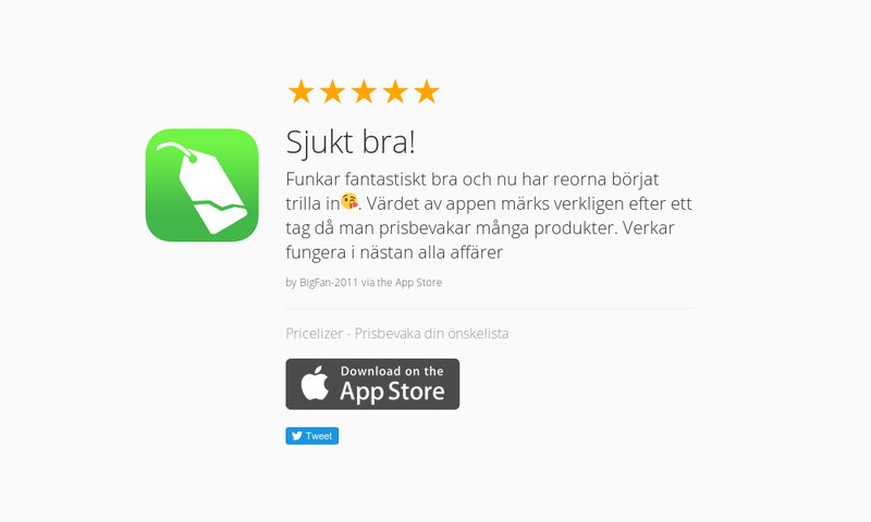 5 Star Review: "Genialisk app!: Pricelizer fungerar fantastiskt bra för att bevaka priser…" https://launchkit.io/reviews/J-s0JkJhUss/ …pic.twitter.com/yu9TS1NSl2